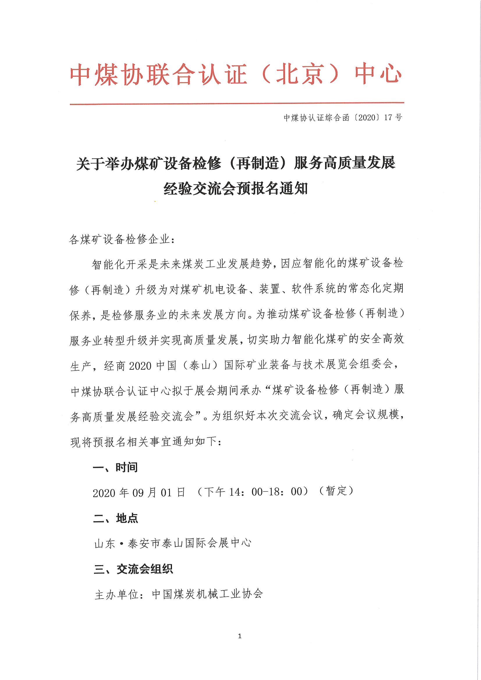 各煤礦設(shè)備檢修企業(yè):為推動(dòng)煤礦設(shè)備檢修(再制造)服務(wù)業(yè)轉(zhuǎn)型升級(jí)并實(shí)現(xiàn)高質(zhì)量發(fā)展,切實(shí)助力智能化煤礦的安全高效生產(chǎn),經(jīng)商2020中國(泰山)國際礦業(yè)裝備與技術(shù)展覽會(huì)組委會(huì),中煤協(xié)聯(lián)合認(rèn)證中心擬于展會(huì)期間承辦“煤礦設(shè)備檢修(再制造)服務(wù)高質(zhì)量發(fā)展經(jīng)驗(yàn)交流會(huì)”。交流...
